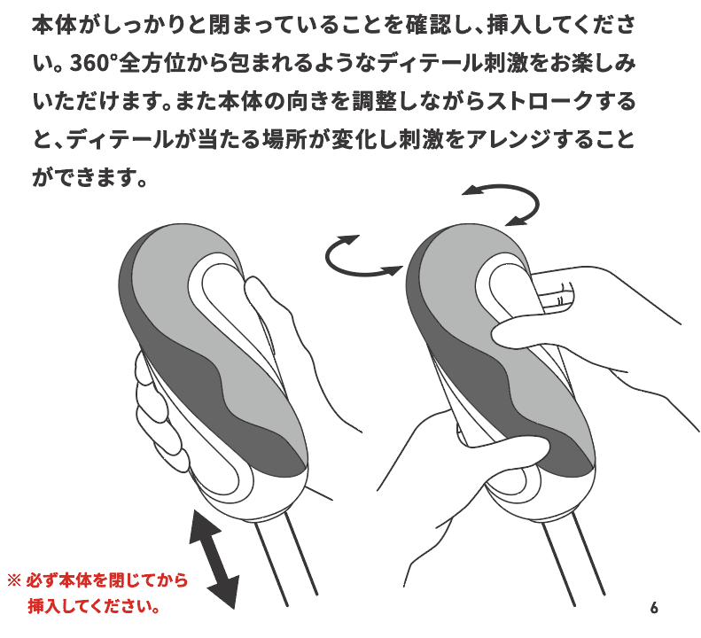 Make sure the device is securely closed before insertion. Freely squeeze, twist, and stroke for a full 360° of stimulation.