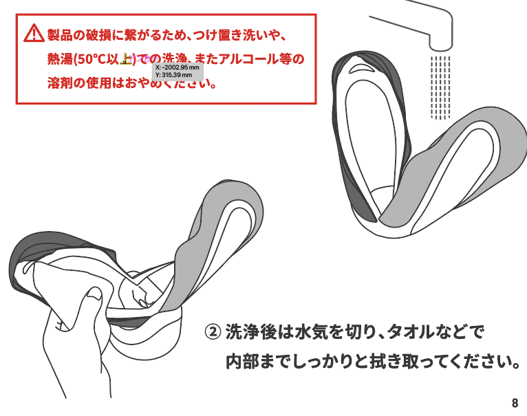 ※ボディーソープなどをご利用いただいても構いませんが、強い酸性・アルカリ性の洗剤のご使用はお避けください。こちらもゲルが劣化する恐れがあります。